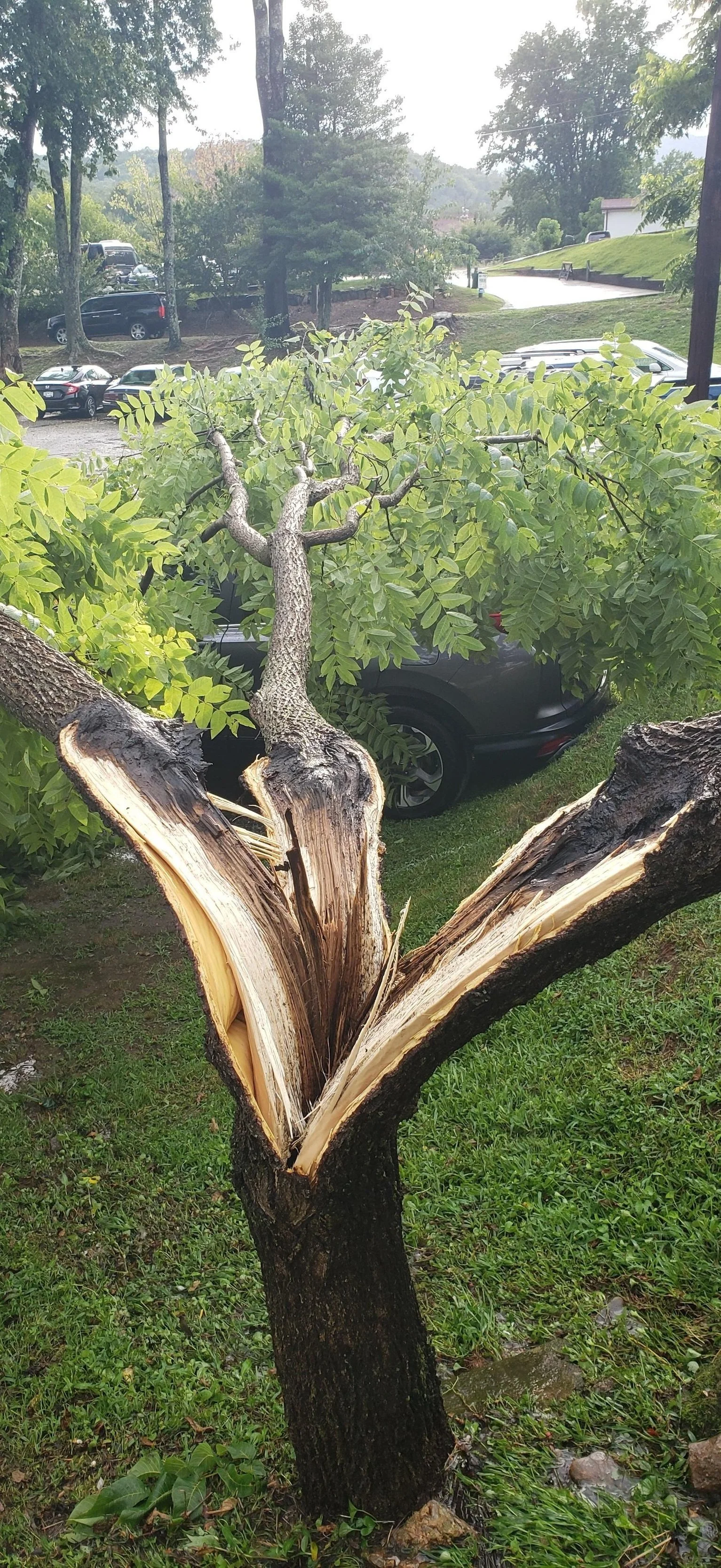 The dark "V" shaped area at the top is included bark that has prevented the wood from fusing between the two branches, contributing to the failure of the branch.Don’t top your trees!